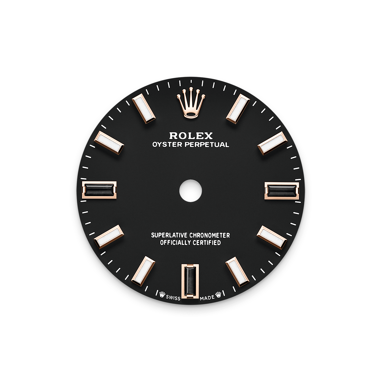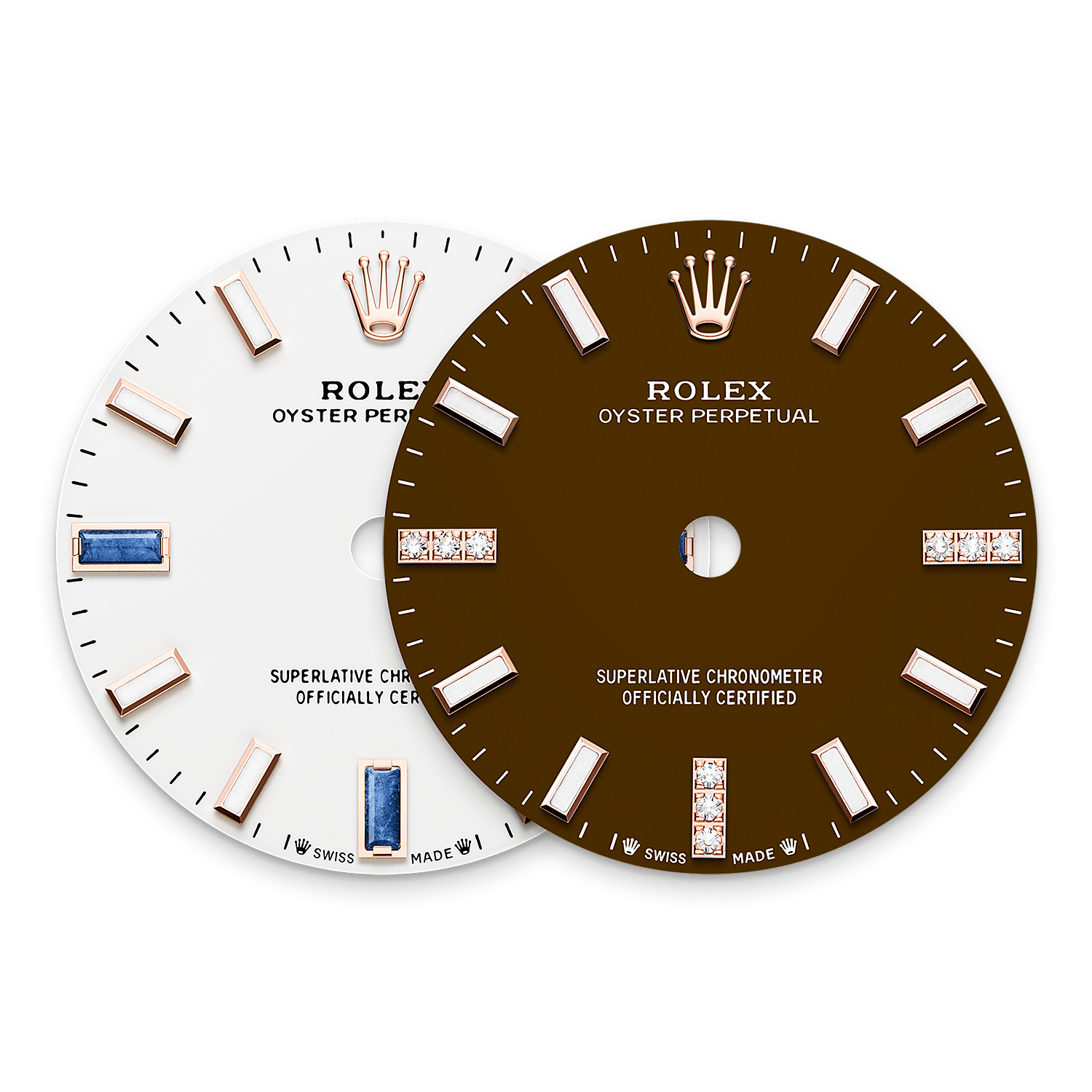 表盘3、6及9点钟位置的钟点标记以天然宝石制成。制作蚝式恒动型系列色调的第一步是喷漆,这工序必须在受控环境中小心进行,以避免灰尘及其他污染物。