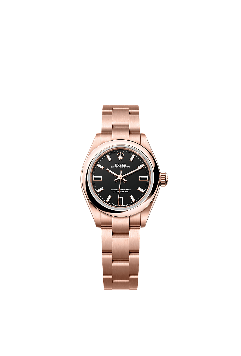蚝式恒动型 28腕表18K永恒玫瑰金款,搭配黑色表盘及蚝式(Oyster)表带。