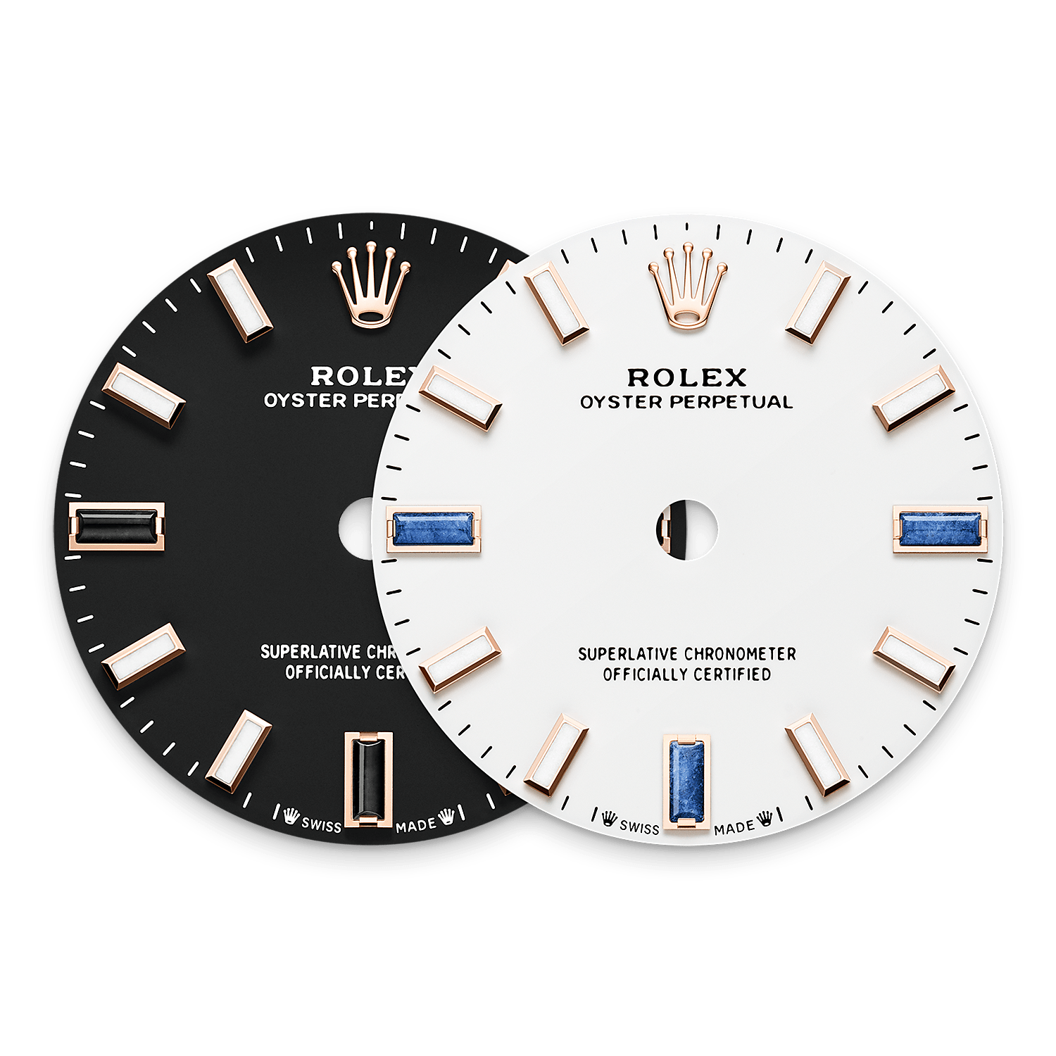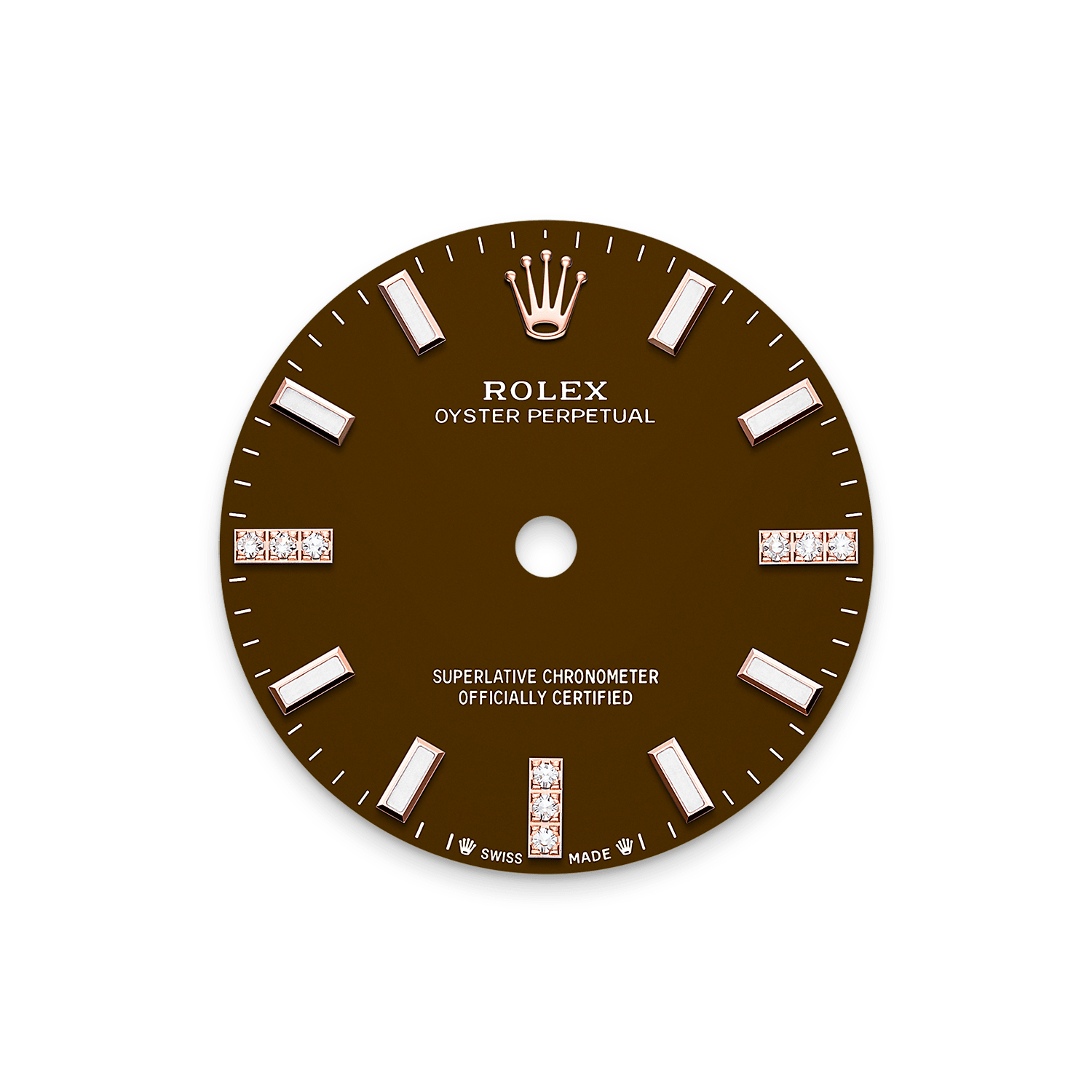 表盘设有镶9颗钻石的3、6和9点钟18K金钟点标记。制作蚝式恒动型系列色调的第一步是喷漆,这工序必须在受控环境中小心进行,以避免灰尘及其他污染物。