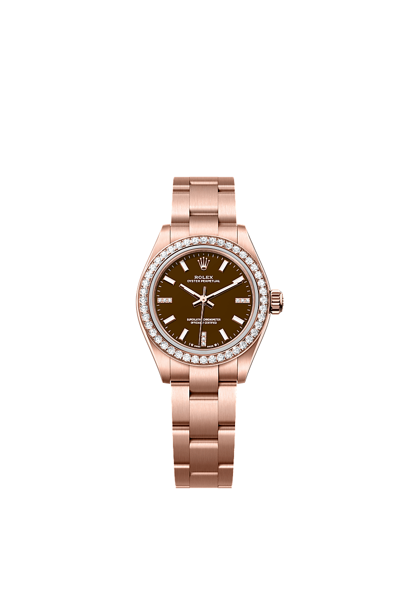 蚝式恒动型 28腕表18K永恒玫瑰金款,搭配镶钻棕石表盘及蚝式(Oyster)表带。