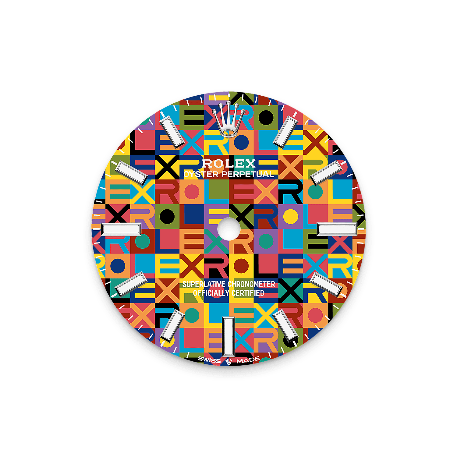 至少十种对比鲜明的色彩交织辉映,呈现“ROLEX”之名。该表盘的设计颇具挑战性,因为这些色彩并非一次完成着色,而是藉由精湛工艺逐一呈现。唯有一丝不苟的精准度,方能确保构成图案的所有形状与字母皆精确定位。