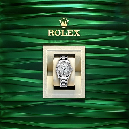 蚝式恒动Pearlmaster 34腕表18ct白色黄金款,搭配镶钻白色珍珠母表盘,配备镶钻石外圈和特色Pearlmaster表带。