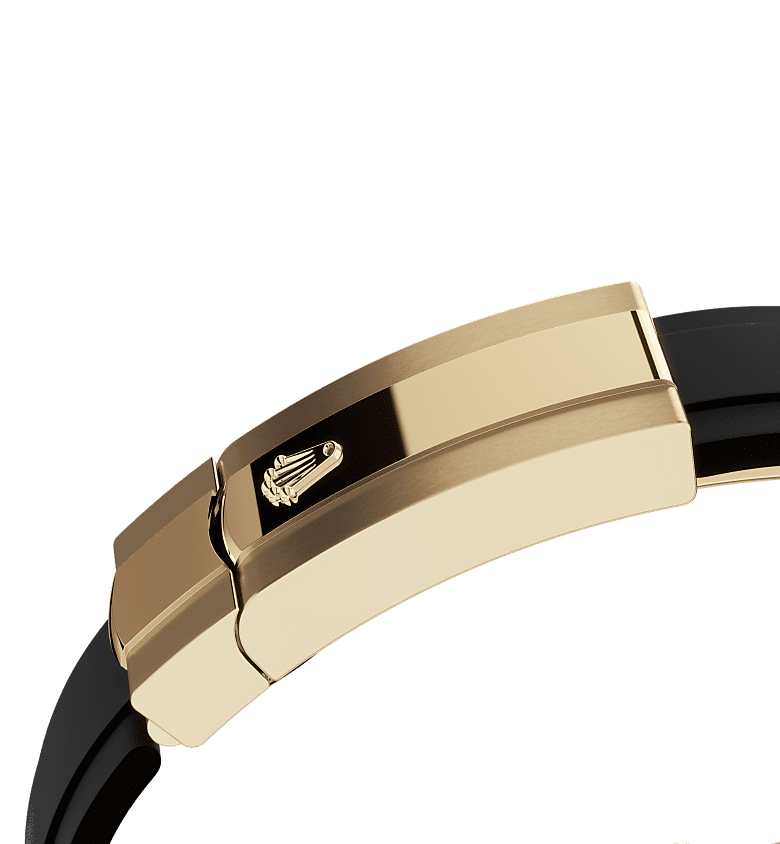 高性能黑色橡胶则将金属片包覆,让腕表于各种环境状况下也不易受影响,持久耐用之余,佩戴亦非常稳固。为确保佩戴更舒适,Oysterflex表带内配备专利纵向缓冲系统,使腕表固定于手腕上。此外,表带亦配备18K黄金蚝式带扣,防止腕表意外开启。表带亦配备劳力士设计并获得专利的Rolex Glidelock延展系统。此创新齿条系统,隐蔽在带扣盖下,无需工具,以每格约2.5毫米逐步延长,最长可达约15毫米左右。
