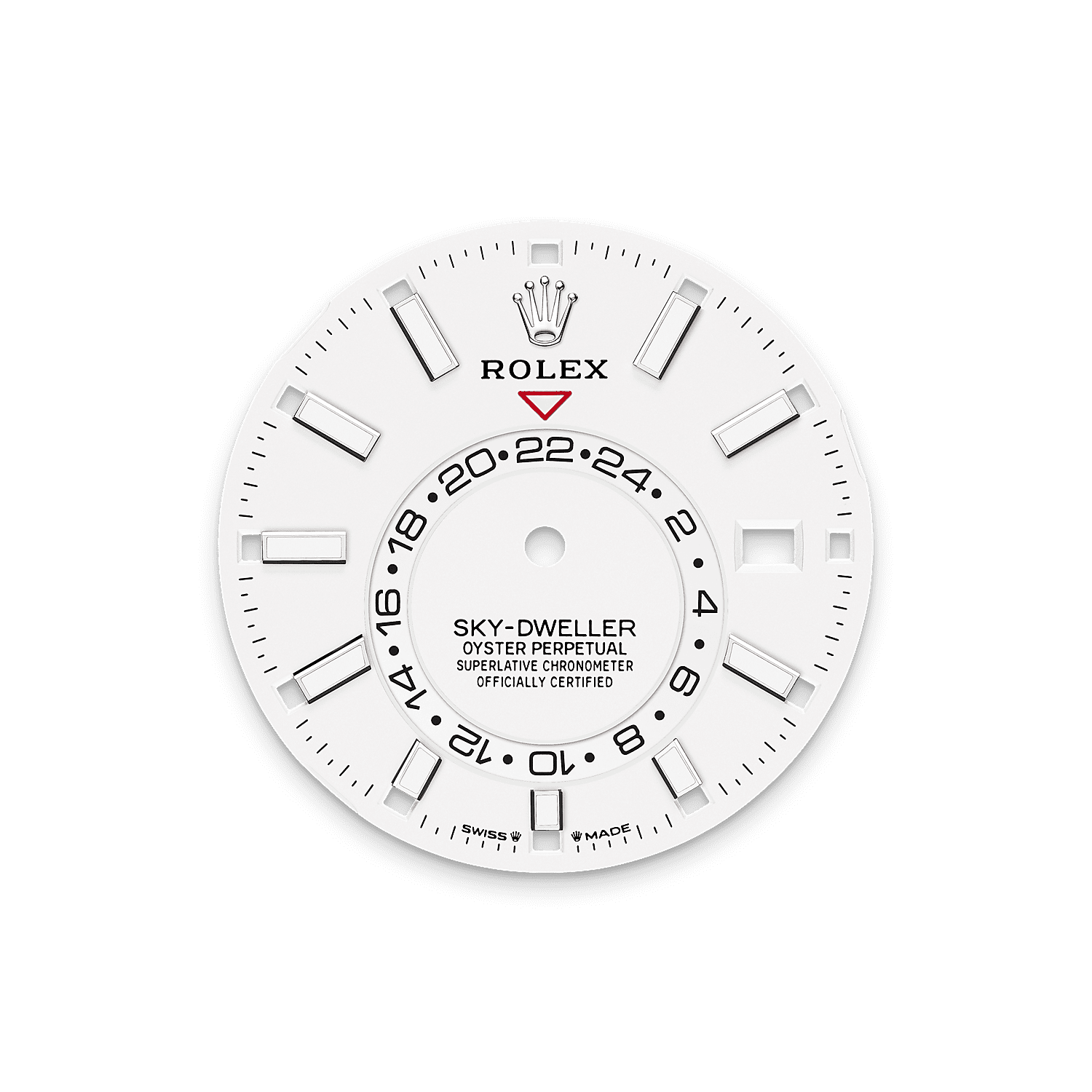 24小时偏轴盘固定红色倒三角可指示佩戴者所选的第二地时间,方便读取居住或工作地区的参考时间。只需一瞥,便可明确区分第二地时区的日与夜。