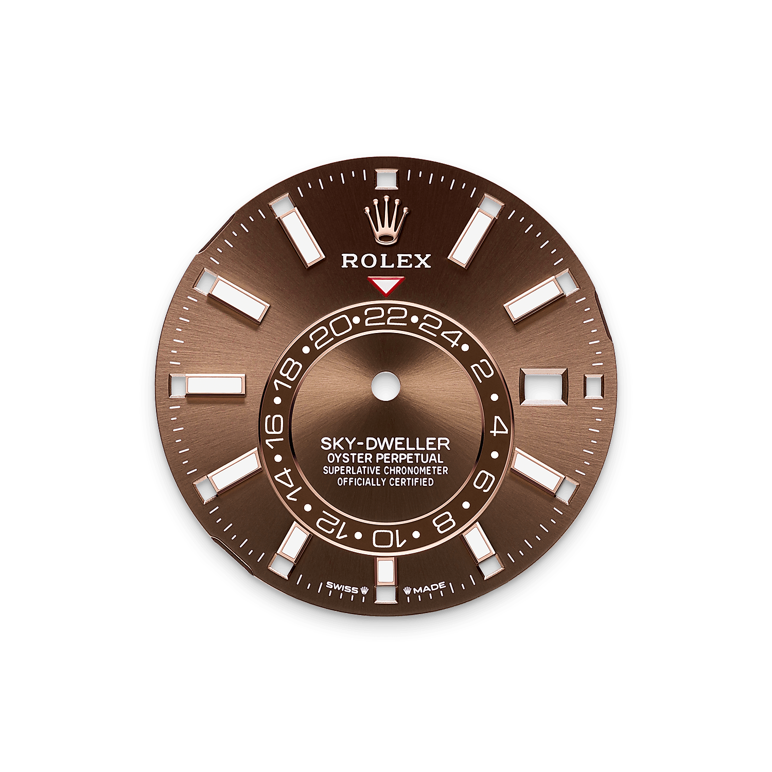 24小时偏轴盘固定红色倒三角可指示佩戴者所选的第二地时间,方便读取居住或工作地区的参考时间。只需一瞥,便可明确区分第二地时区的日与夜。