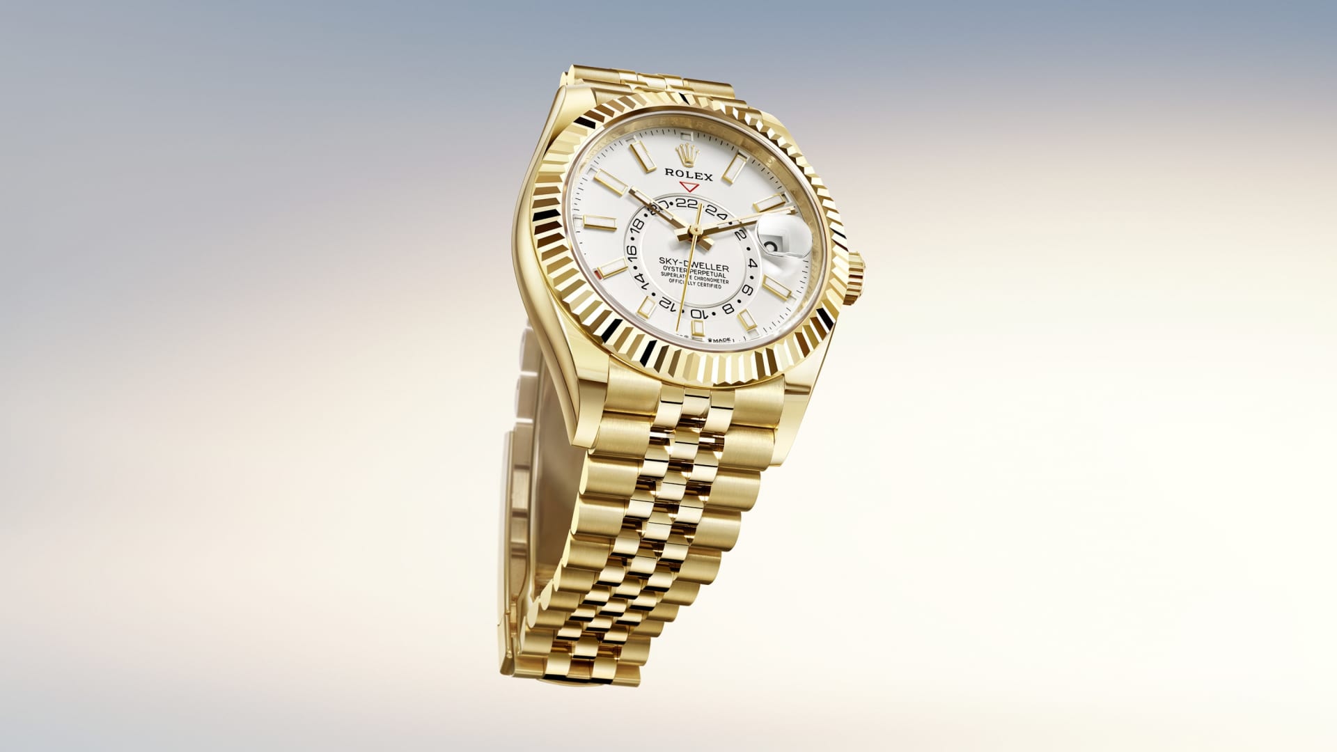 蚝式恒动纵航者型腕表18K黄金款,搭配醇白色表盘及纪念型(Jubilee)表带。