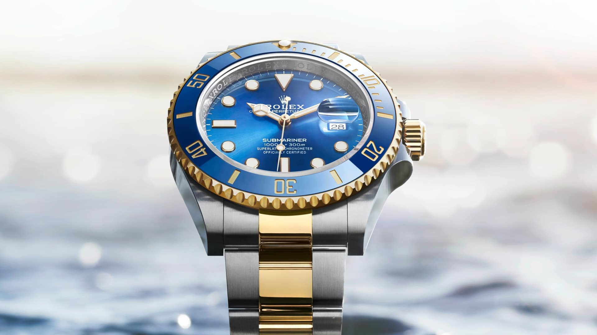 蚝式恒动潜航者日历型腕表黄金及蚝式钢款,搭配蓝色Cerachrom陶质字圈、皇家蓝色表盘及特大夜光钟点标记。