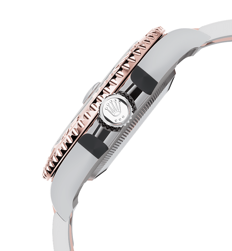蚝式恒动游艇名仕型 40腕表永恒玫瑰金及蚝式钢款,搭配蚝式(Oyster)表带。